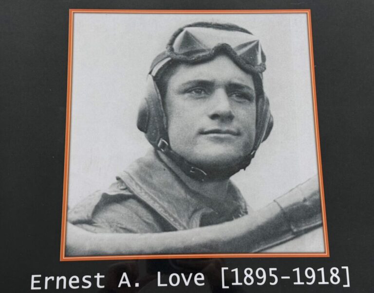 The airport honors Ernest Alexander Love (1895–1918), First Lieutenant, United States Army Air Service. Love was born in New Mexico and raised in Prescott. He was a graduate of Prescott High School and later studied mechanical engineering at Stanford University.   During World War I, he served as a fighter pilot.  Lieutenant Love’s aircraft was shot down near Verdun, France, on September 16, 1918;  he died of his wounds as a prisoner of war a few days later. Lieutenant Love is buried at Arlington National Cemetery.  The Airport was officially dedicated in his name on August 28, 1928.